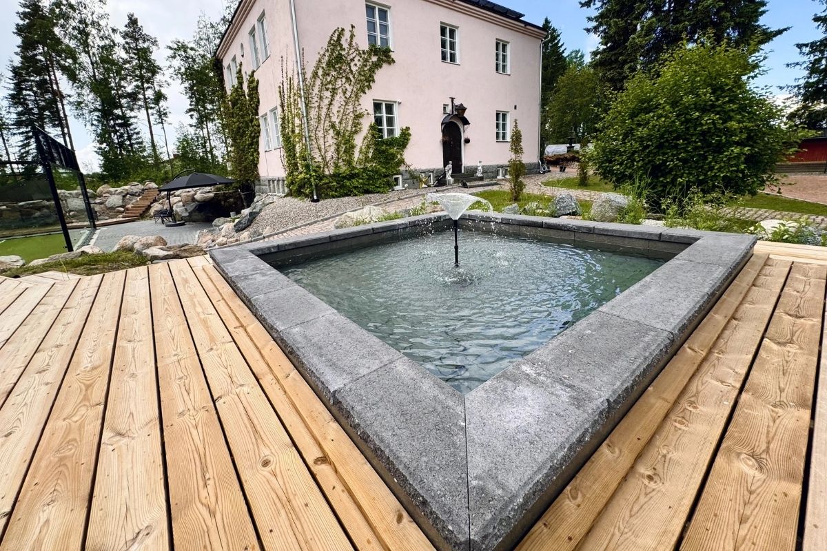 Muurikivet: Suihkulähteen ympärillä hyödynnettiin mustia patinoituja isoja muurikiviä sekä mustia muurikivien kansikiviä.