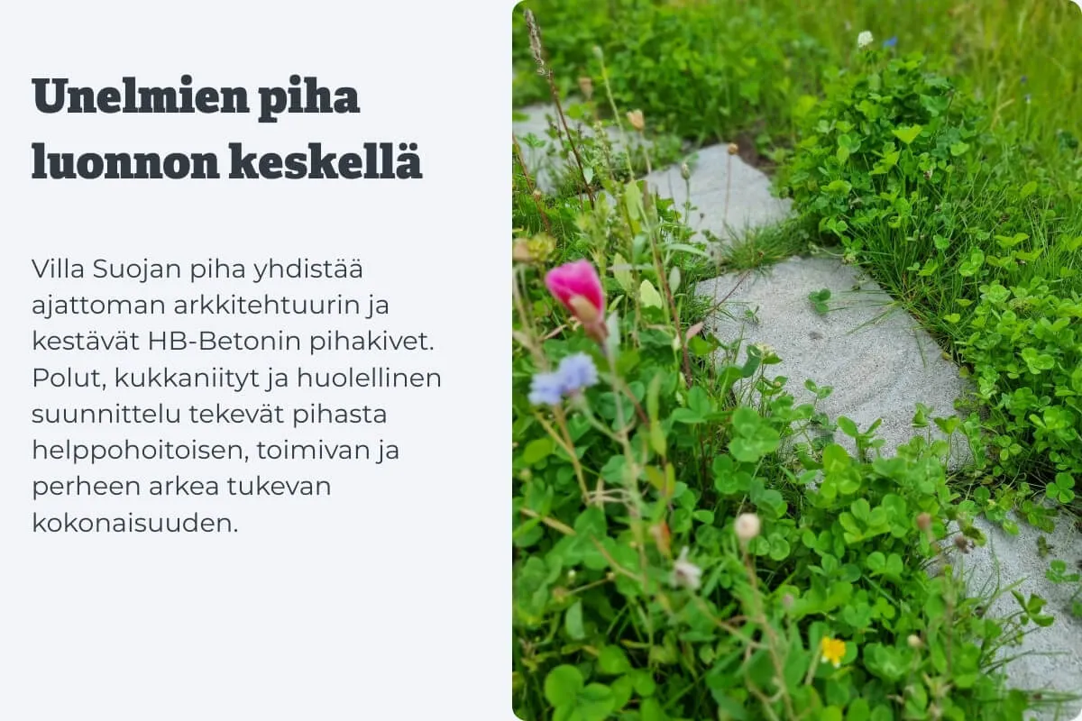 Sisäänkäynnin pihakivituotteet ja polkujen kalliokivet istuvat täydellisesti talon arkkitehtuuriin ja luovat yhtenäisen ilmeen. "Betonikivet antavat luonnollisen ja aidon tuntuman", perhe toteaa. Lopputuloksena on rauhallinen, käytännöllinen ja ajaton piha, joka tukee sujuvaa arkea, kutsuu viihtymään ja mahdollistaa perheen elämän luonnon keskellä.
