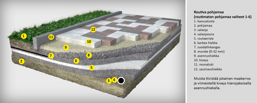 Routivien maa-ainesten poistamisen jälkeen muotoile kaivannon pohja suunniteltuun kaltevuuteen, asenna tarvittaessa eristelevyt, tasoita kaivanto kivettömällä hienojakoisella sora-aineksella ja tiivistä. Asenna suodatinkangas, joka estää pohjakerroksen ja kantavan kerroksen maa-ainesten sekoittumisen. Tämän jälkeen täytä kaivanto kerroksittain kantavalla ja routimattomalla maa-aineksella välillä huolellisesti tiivistäen, täryttäen. Tarkista ennen asennushiekan levittämistä, että kantavan kerroksen pinta on tasainen ja että kallistukset on tehty suunnitelman mukaisesti (kaato on n. 20 mm/metri rakennuksista poispäin).
